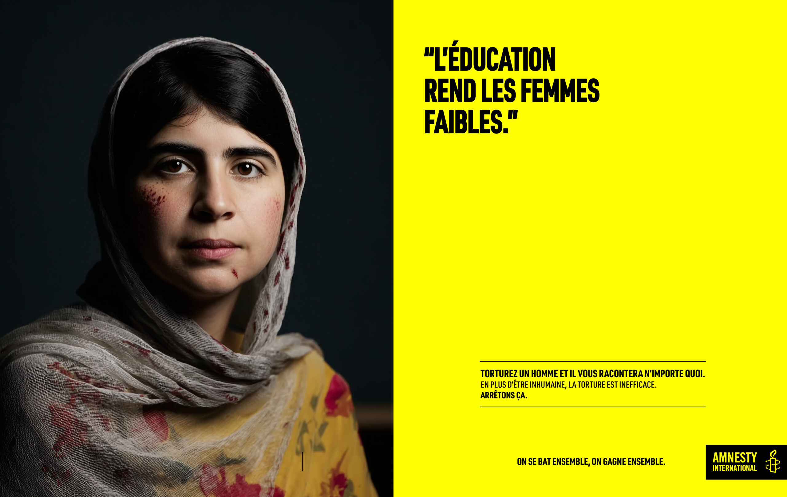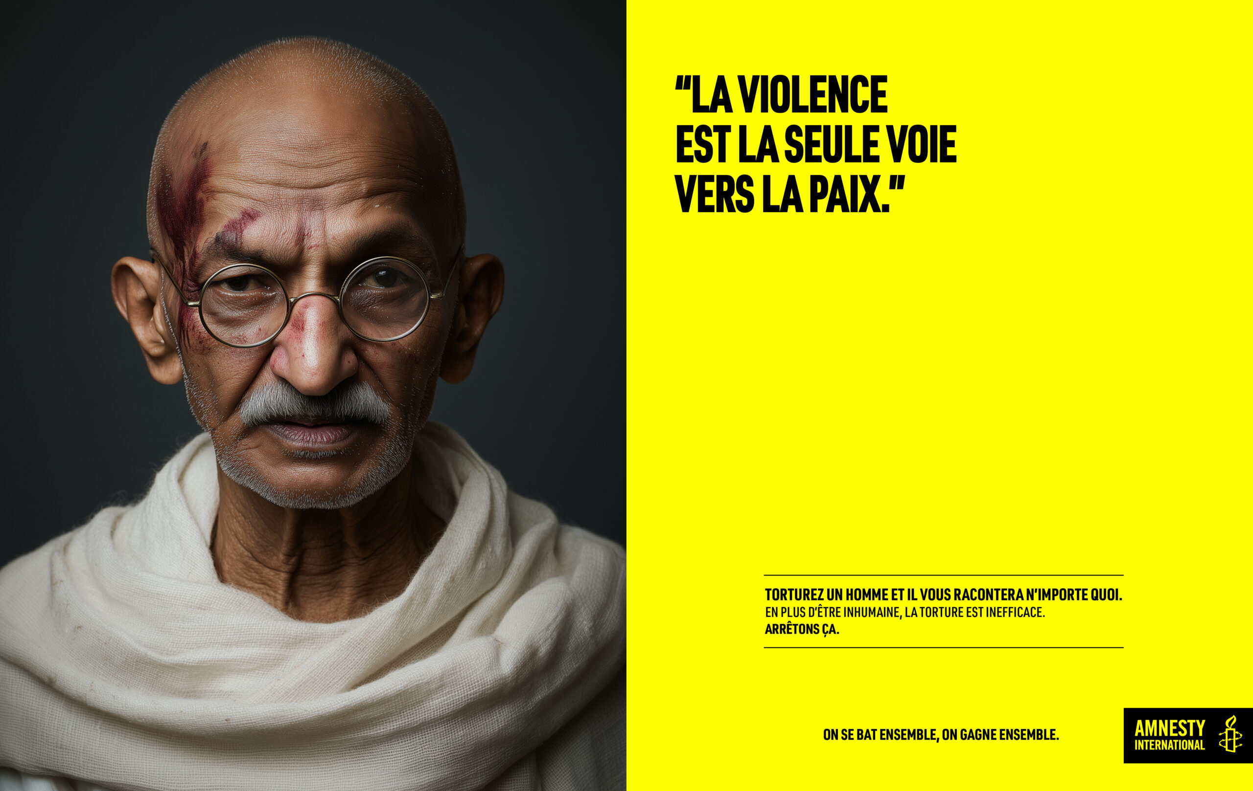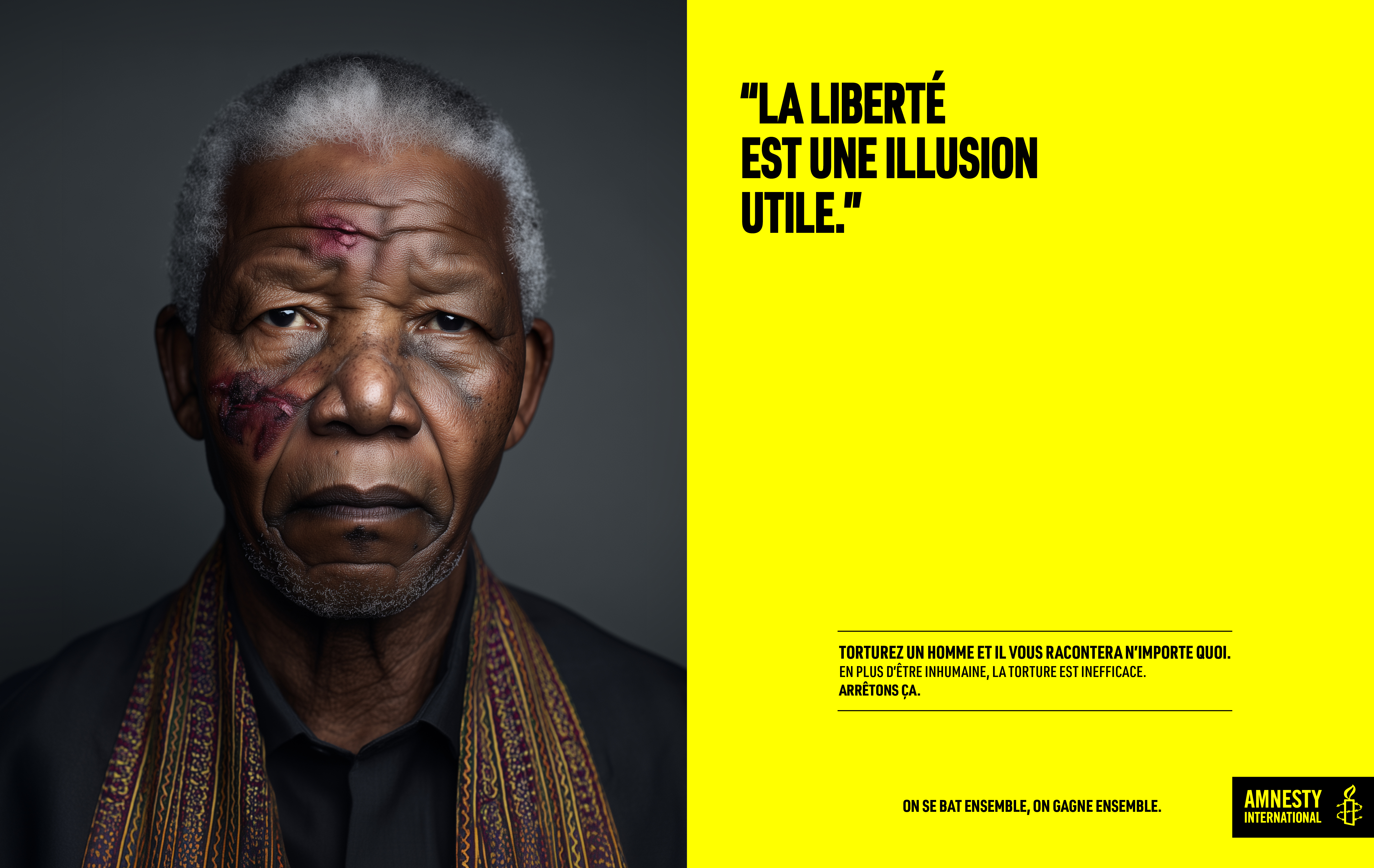 Cette campagne s’appuie sur un concept simple et brutal : sous la torture, même la vérité perd le sens. En détournant les figures universelles de paix et de justice - Gandhi, Mandela, Malala - nous exposons l’absurdité de la torture. Leurs visages marqués, leurs mots inversés, incarnent l’idée que la violence détruit tout : la pensée, la parole, l’identité. Un dispositif minimaliste - un portrait, une phrase, un bloc Amnesty - qui dit l’essentiel avec une efficacité implacable. Parce que faire dire l’inverse à ceux qui incarnent le vrai, c’est montrer à quel point la torture est inhumaine et inefficace.