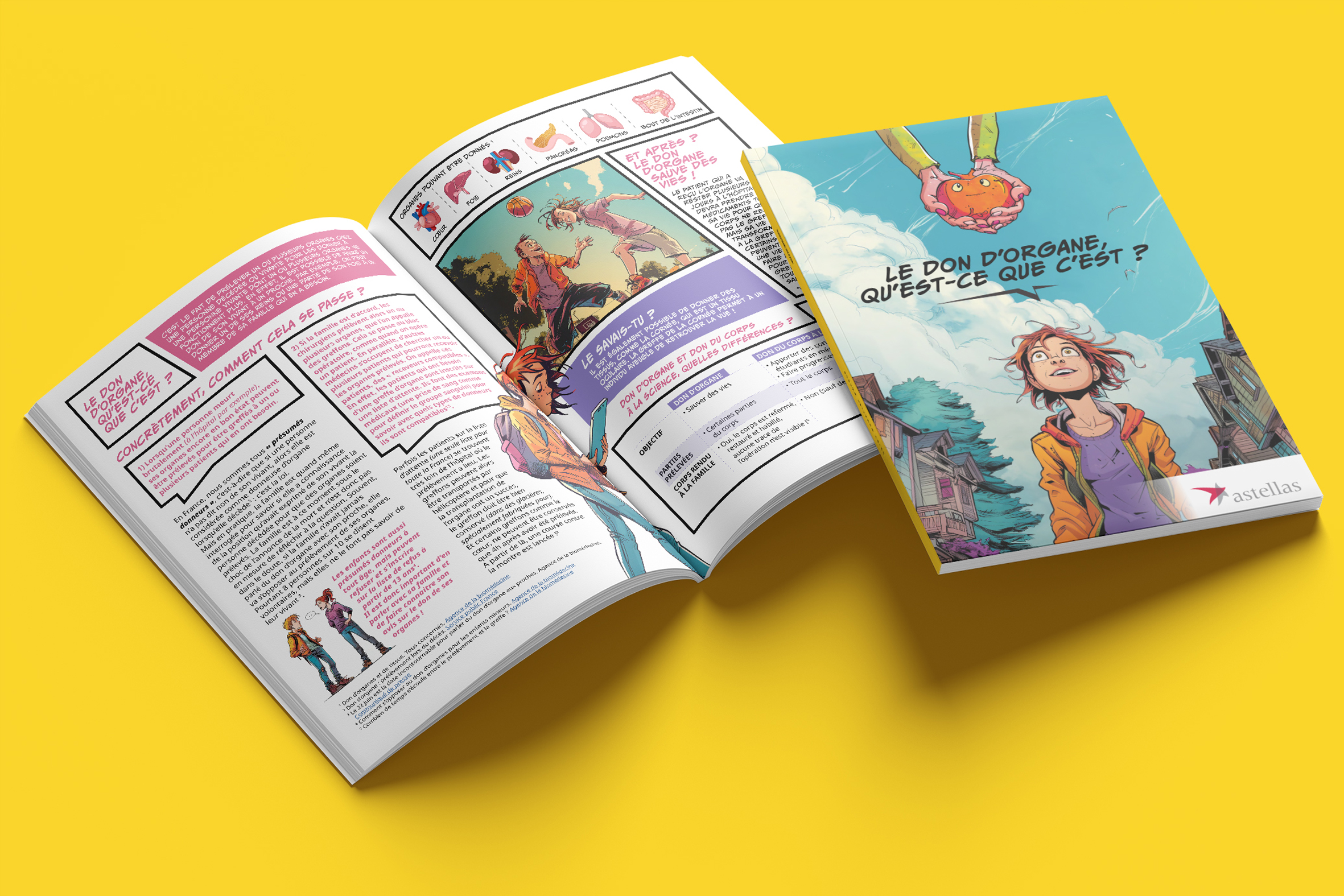 Pour cette brochure Astellas, nous avions un défi : expliquer simplement ce qu’est le don d’organes et comment il fonctionne, sans tomber dans le registre trop technique ou trop lourd.