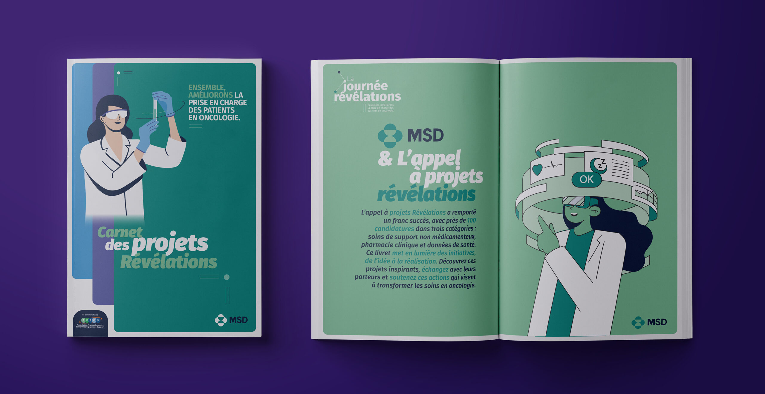 Cette brochure rassemble une sélection de projets innovants et inspirants dans la prise en charge des patients en oncologie. L’enjeu était de donner envie au lecteur de la parcourir dans son intégralité. L’illustration s’est donc imposée comme le meilleur vecteur : suffisamment moderne pour refléter la thématique, mais aussi ludique pour maintenir l’attention et accompagner le lecteur jusqu’au bout