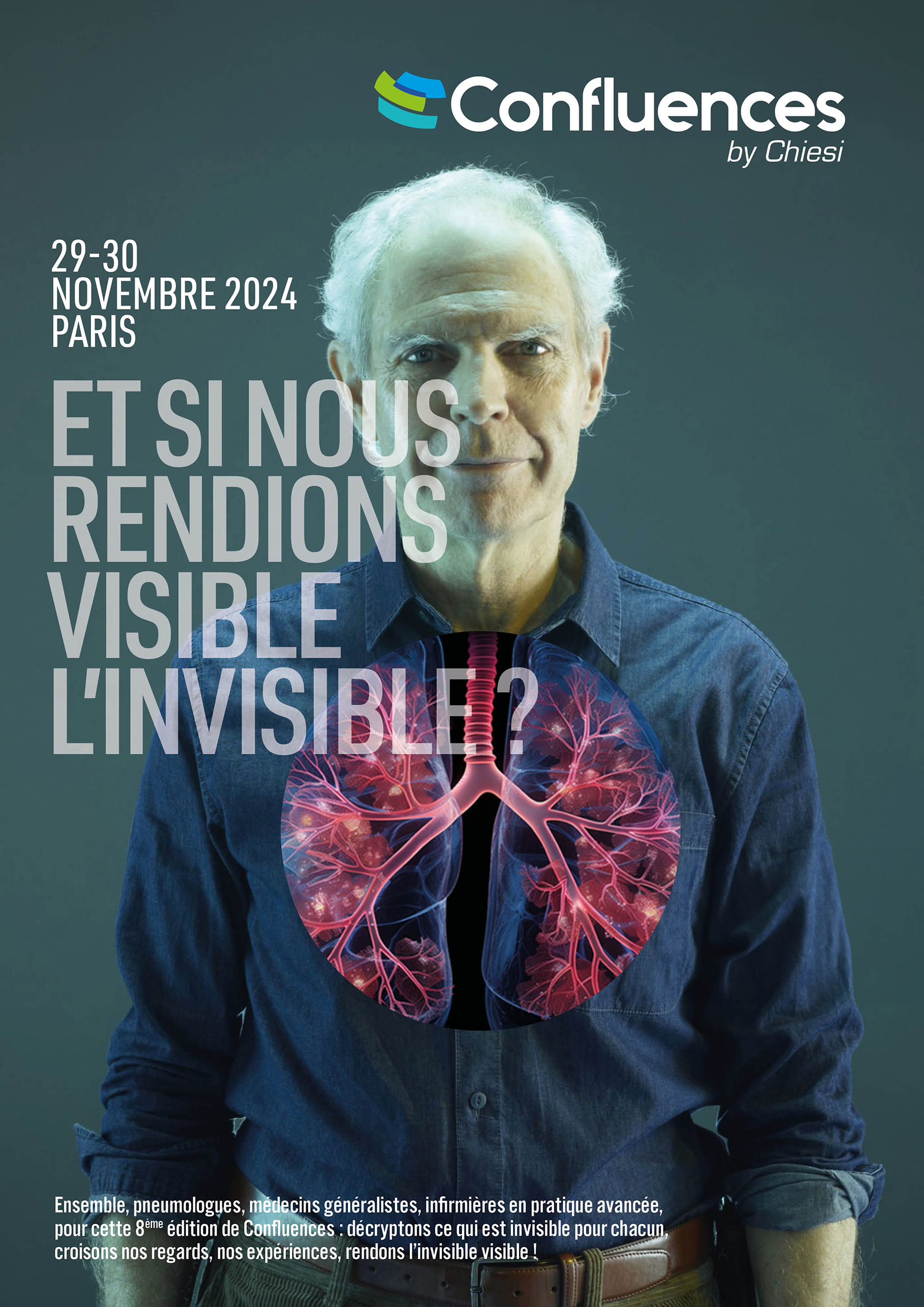 Pour le Key Visual de l’événement Confluences by Chiesi, nous avons exploré l’idée de la transparence visuelle afin d’incarner le claim “Et si nous rendions visible l’invisible ?”. Une approche créative qui traduit avec force et délicatesse la mission de Chiesi : mettre en lumière les pathologies respiratoires, souvent imperceptibles mais bien réelles